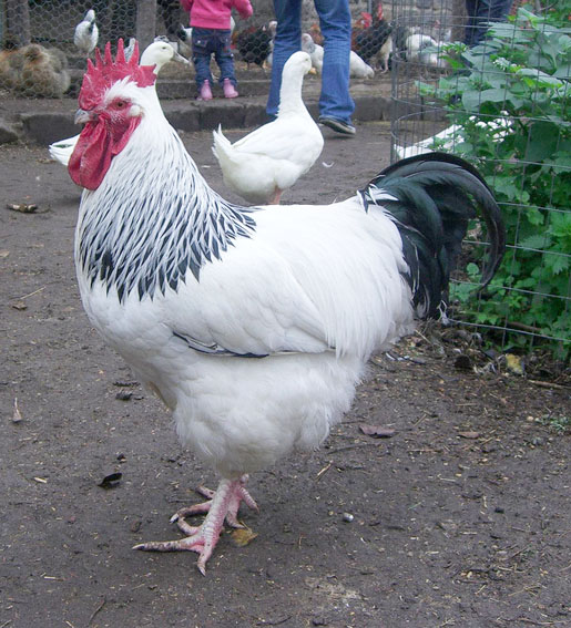 The Sussex chicken, whatever color, should be graceful with a long, broad, flat back and a rectangular build, the tail should be at a 45 degree angle from the body. The eyes should be red in the darker varieties but orange in the lighter one and they sport a medium sized, single, erect comb. The earlobes are red and the legs and skin white in every variety. Cocks should weigh approx 9 lbs, and the hens (females) 7 lbs.
